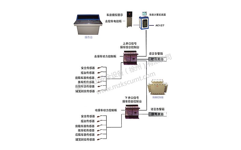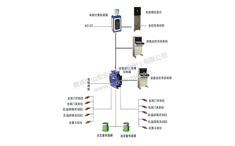 《煤礦安全規(guī)程》382條規(guī)定“箕斗提升必須采用定重裝載”的規(guī)定。主井提升信號及定重裝載系統(tǒng)系統(tǒng)可實(shí)現(xiàn)井下定重裝載自動控制,井上數(shù)據(jù)管理和卸載系統(tǒng)自動控制。系統(tǒng)由稱重傳感器、井上下PLC可編程控制箱、裝載液壓站、井上下操作臺及絞車房狀態(tài)顯示箱等組成。