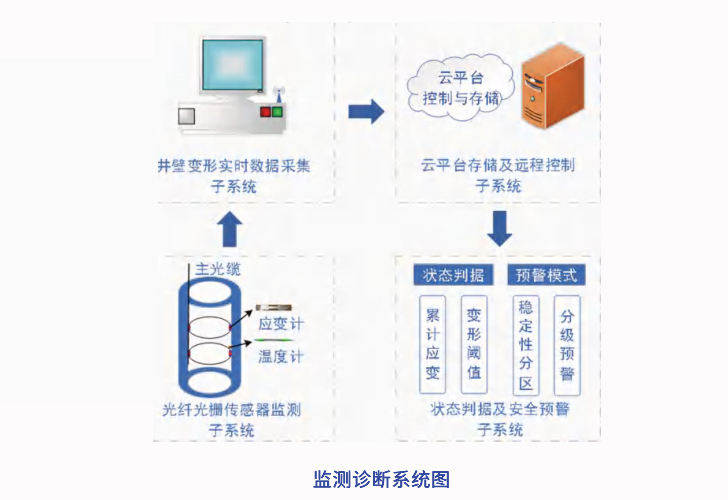 通過在井壁和罐道上安裝光纖傳感器,并與監(jiān)測室中光纖解調(diào)儀相連,采集井壁和罐道變形的環(huán)向應變和軸向應變數(shù)據(jù),實現(xiàn)井壁和罐道變形的實時監(jiān)測。