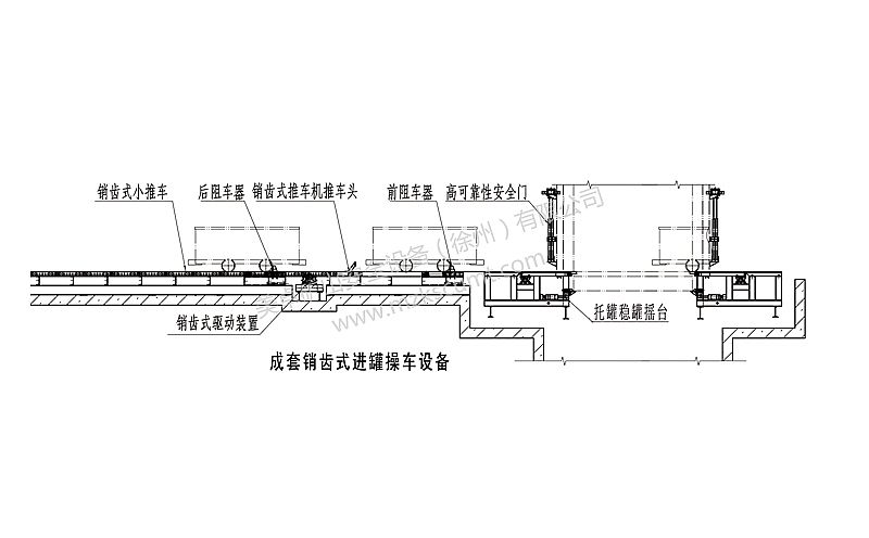 操車系統(tǒng)成套技術(shù)設(shè)備是由銷齒推車機(jī)、搖臺(搭接搖臺、托罐搖臺、托罐鎖罐搖臺)阻車器、安全門、液壓系統(tǒng)、電控及信號系統(tǒng)等部分組成。
