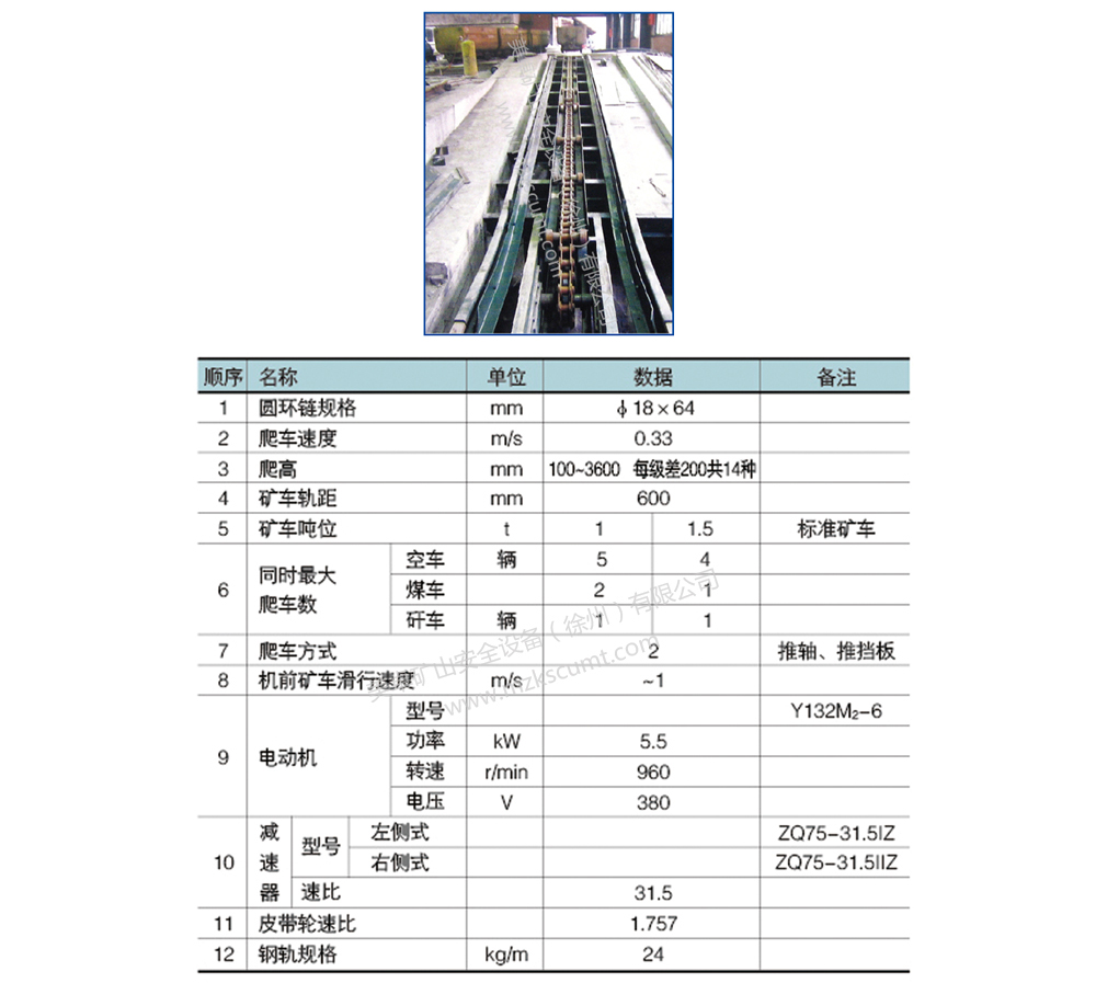 適用于600軌距1T和1.5T標(biāo)準(zhǔn)礦車向上爬高之用,根據(jù)爬高不同共有14種型號,每種又以傳動裝置布置方式不同分為左側(cè)式和右側(cè)式,具體根據(jù)現(xiàn)場情況進(jìn)行設(shè)計(jì)。