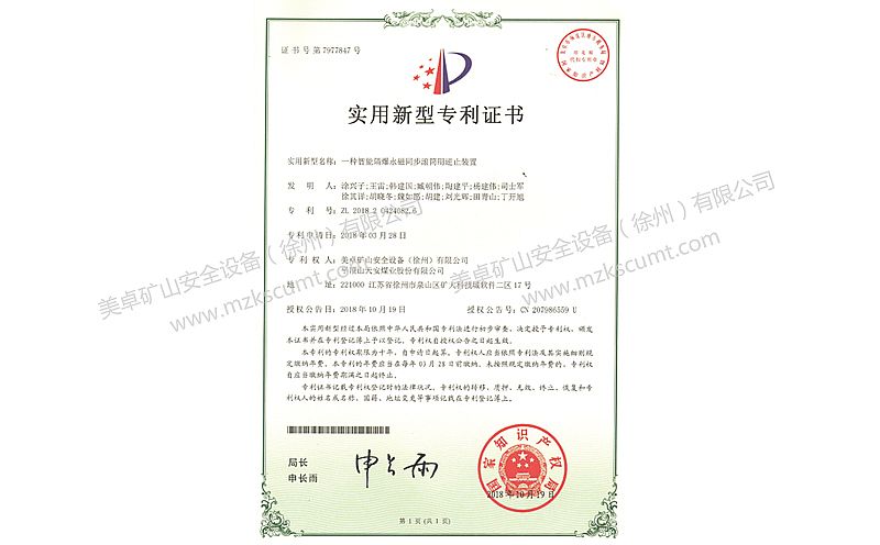 隔爆永磁同步滾筒用逆止裝置專(zhuān)利證書(shū)